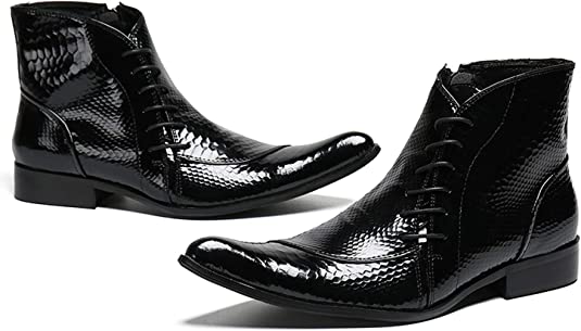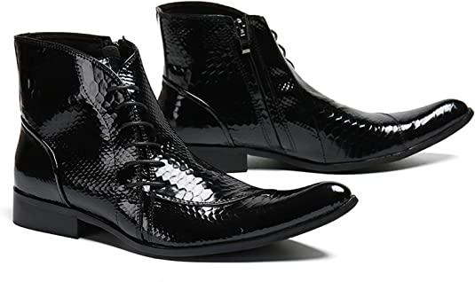 • Diseño moderno de punta puntiaguda y charol: punta puntiaguda con decoración de cordones, botas únicas de charol genuino para hombre.